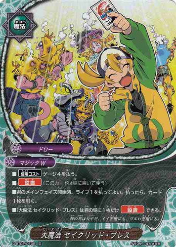 ![]() ![]() | D-BT01/0106 大魔法 セイクリッド・ブレス 魔法 DDD ブースターパック 第1弾 放て!必殺竜!! 並 ワールド:マジックW 属性:ドロー ■【使用コスト】ゲージ4を払う。 ■【設置】(このカードは場に置いて使う) ■君のメインフェイズ開始時、ライフ1を払ってよい。払ったら、カード1枚を引く。 ■「大魔法 セイクリッド・ブレス」は君の場に1枚だけ【設置】できる。 神の光は公平だ。イイ悪魔にも、ワルい悪魔にも。 イラスト:なかざき冬 |