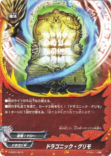 ![]() ![]() | D-SD01/0010 ドラゴニック・グリモ 魔法 DDD 500円スタートデッキ 第1弾 爆熱太陽竜 ワールド:ドラゴンW 属性:金竜/ドロー ■君のライフが5以下なら使える。 ■君の手札全てを捨て、カード3枚を引く。「ドラゴニック・グリモ」は1ターンに1回だけ使える。(捨てる手札が0枚でも使えるぞ!) 竜は記した。己の持つすべての知識を。 イラスト:一日郎 |