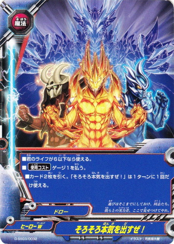 ![]() ![]() | D-SS03/0032 そろそろ本気を出すぜ! 魔法 DDD スペシャルシリーズ 第3弾 ゴールデンバディチャンピオンボックス ワールド:ヒーローW 属性:ドロー ■君の場のライフが6以下なら使える。 ■【使用コスト】ゲージ1を払う。 ■カード2枚を引く。「そろそろ本気を出すぜ!」は1ターンに1回だけ使える。 遊びはそこまでにしておけ、同志たち。 我らとの実力差、ここで見せつけてやれ。 イラスト:月見里大樹 |