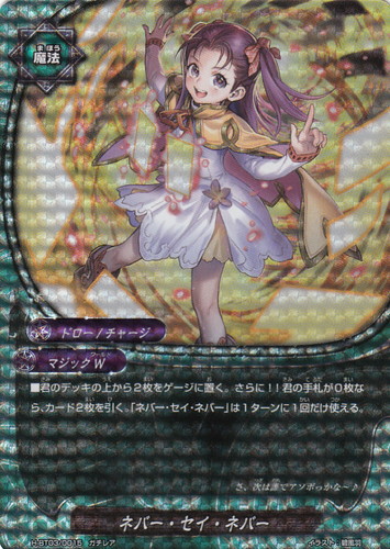![]() ![]() | H-BT03/0015 ネバー・セイ・ネバー 魔法 ハンドレッド ブースターパック 第3弾 角王大出陣!! ガチレア ワールド:マジックW 属性:ドロー/チャージ ■君のデッキの上から2枚をゲージに置く。さらに!!君の手札が0枚なら、カード2枚を引く。「ネバー・セイ・ネバー」は1ターンに1回だけ使える。 さ、次は誰でアソボっかな~♪ イラスト:碧風羽 |