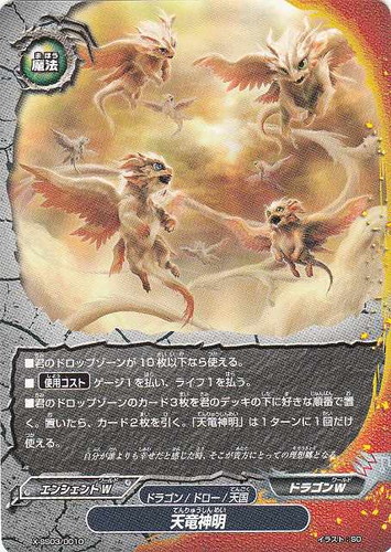 ![]() ![]() | X-SS03/0010 天竜神明 魔法 バッツ スペシャルシリーズ 第3弾 5WORLD BUILD MASTERS ワールド:ドラゴンW/エンシェントW 属性:ドラゴン/ドロー/天国 ■君のドロップが10枚以下なら使える。 ■【使用コスト】ゲージ1を払い、ライフ1を払う。 ■君のドロップのカード3枚を君のデッキの下に好きな順番で置く。置いたら、カード2枚を引く。「天竜神明」は1ターンに1回だけ使える。 自分が誰よりも幸せだと感じた時、そこが貴方にとっての理想郷となる。 イラスト:SO |