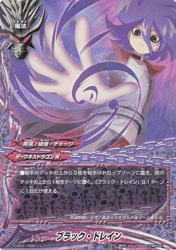 ![]() ![]() | D-BT01/0041 ブラック・ドレイン 魔法 DDD ブースターパック 第1弾 放て!必殺竜!! レア(foil) ワールド:ダークネスドラゴンW 属性:黒竜/破壊/チャージ ■相手のデッキの上から3枚を相手のドロップゾーンに置き、君のデッキの上から1枚をゲージに置く。「ブラック・ドレイン」は1ターンに1回だけ使える。 黒竜の使い手は、他者の力を自らの養分へと変える。 イラスト:鉢戸ヒカル(Panda Graphics) |