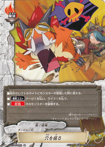 ![]() ![]() | D-BT04/0093 穴を掘る 魔法 DDD ブースターパック 第4弾 輝け!超太陽竜!! (foil) ワールド:ダンジョンW 属性:罠/破壊 ■相手のレフトかライトにモンスターが登場した時に使える。 ■【使用コスト】ゲージ1を払い、ライフ1を払う。 ■【対抗】そのモンスターを破壊する。 「掘りぬいた!……アレ?」 「ギャーッ!?おしりに穴あいたバルーッ!」 イラスト:里々(Panda Graphics) |