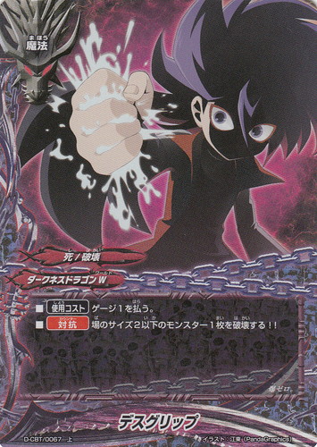 ![]() ![]() | D-CBT/0067 デスグリップ 魔法 DDD クライマックスブースター ドラゴンファイターズ 上 ワールド:ダークネスドラゴンW 属性:死/破壊 ■【使用コスト】ゲージ1を払う。 ■【対抗】場のサイズ2以下のモンスター1枚を破壊する!! 爆ゼロ。 イラスト:江東(Panda Graphics) |