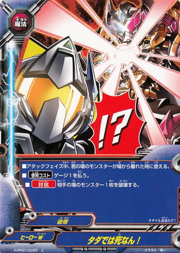 ![]() ![]() | H-PP01/0065 タダでは死なん! 魔法 ハンドレッド パーフェクトパック 第1弾 決戦!!裏角王 上(foil) ワールド:ヒーローW 属性:破壊 ■アタックフェイズ中、君の場のモンスターが場から離れた時に使える。 ■【使用コスト】ゲージ1を払う。 ■【対抗】相手の場のモンスター1枚を破壊する。 キサマも道連れだ! イラスト:晃一 |