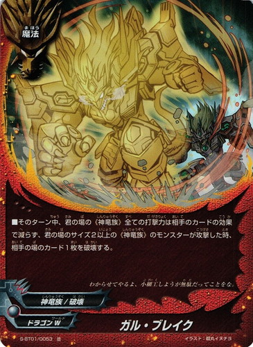 ![]() ![]() | S-BT01/0053 ガル・ブレイク 魔法 神バディファイト ブースターパック 第1弾 闘神ガルガンチュア 並 ワールド:ドラゴンW 属性:神竜族/破壊 ■そのターン中、君の場の《神竜族》全ての打撃力は相手のカードの効果で減らず、君の場のサイズ2以上の《神竜族》のモンスターが攻撃した時、相手の場のカード1枚を破壊する。 わからせてやるよ、小細工しようが無駄だってことをな。 イラスト:瞑丸イヌチヨ |