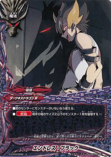 ![]() ![]() | X-CP03/0052 エンドレス・ブラック 魔法 バッツ キャラクターパック 第3弾 よっしゃ!!100円ダークネスドラゴン 上 ワールド:ダークネスドラゴンW 属性:破壊 ■君のセンターにモンスターがいないなら使える。 ■【対抗】相手の場のサイズ2以下のモンスター1枚を破壊する!! 悪魔は悪魔らしく、狡く賢く自分勝手に生きるのが一番だべ。 イラスト:たり(Panda Graphics) |