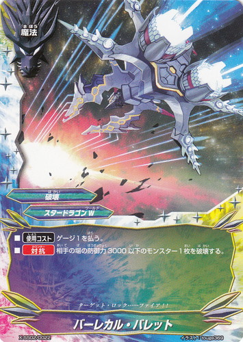 ![]() ![]() | X-SS02/0022 バーレカル・バレット 魔法 バッツ スペシャルシリーズ 第2弾 レディアント・エヴォリューションVS断罪 煉獄騎士団 ワールド:スタードラゴンW 属性:破壊 ■【使用コスト】ゲージ1を払う。 ■【対抗】相手の場の防御力3000以下のモンスター1枚を破壊する。 ターゲット・ロック・・・・・・ファイア!! イラスト:touge369 |