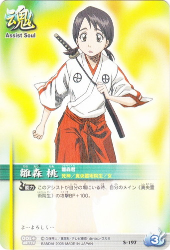 ![]() ![]() | S-197 雛森 桃 アシストソウル コインプラス2 称号:雛森君 特徴:死神/真央霊術院生/女 駆けつけコスト:3 【能力】このアシストが自分の場にいる時、自分のメイン《真央霊術院生》の攻撃BP+100。 BP修正値:ALL BP+100 よ・・・よろしく・・・ |