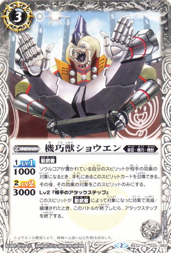 ![]() ![]() | BS33-033 機巧獣ショウエン スピリット 烈火伝 第3章 U 色:白 系統:家臣・機巧・機獣 ブロック:2 コスト:3 軽減:[白1] シンボル:[白1] [1]LV1:1000 [2]LV2:3000 【影武者】 ソウルコアが置かれている自分のスピリットが相手の効果の対象になるとき、手札にあるこのスピリットカードを召喚できる。その後、その効果の対象をこのスピリットのみにする。 Lv2『相手のアタックステップ』 このスピリットが【影武者】によって対象になった効果で消滅/破壊されたとき、このバトルが終了したら、アタックステップを終了する。 ショウエンの挑発により、陣城へと誘い込む作戦は成功した。 illust:高坂 巧 |