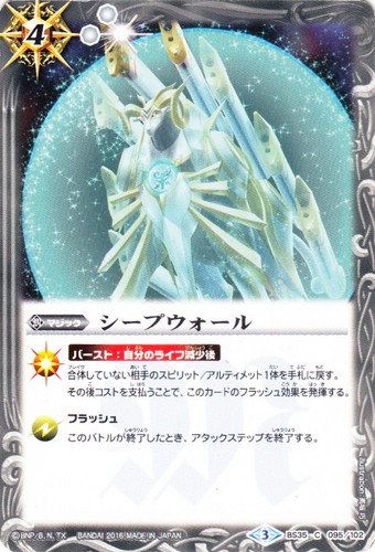 ![]() ![]() | BS35-095 シープウォール マジック 十二神皇編 第1章 C 色:白 ブロック:3 コスト:4 軽減:[白2] 【バースト:自分のライフ減少後】 合体していない相手のスピリット/アルティメット1体を手札に戻す。 その後コストを支払うことで、このカードのフラッシュ効果を発揮する。 フラッシュ このバトルが終了したとき、アタックステップを終了する。 illust:高坂 巧 |