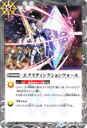 ![]() ![]() | BS40-088 エクスティンクションウォール マジック 煌臨編 第1章:伝説ノ英雄 C 色:白 ブロック:4 コスト:5 軽減:[白3] 【バースト:自分のライフ減少後】 このバースト発動時に減ったライフのコア1個につき、ボイドからコア1個を自分のライフに置く。その後、コストを支払うことで、このカードのフラッシュ効果を発揮する。 フラッシュ このバトルが終了したとき、アタックステップを終了する。 illust:高坂 巧 |