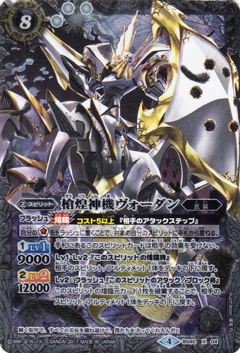 ![]() ![]() | BS40-X04 槍煌神機ヴォーダン スピリット 煌臨編 第1章:伝説ノ英雄 X 色:白 系統:武装 ブロック:4 コスト:8 軽減:[白3] シンボル:[白1] [1]LV1:9000 [2]LV2:1200 フラッシュ【煌臨】コスト5以上『相手のアタックステップ』 自分のソウルコアをトラッシュに置くことで、対象の自分のスピリットに手札から重ねる。 手札にあるこのスピリットカードは相手の効果を受けない。 Lv1・Lv2『このスピリットの煌臨時』 相手のスピリット/アルティメット1体をデッキの下に戻す。 Lv2:フラッシュ『このスピリットのアタック/ブロック時』 このスピリットの煌臨元カード1枚を破棄することで、相手のスピリット/アルティメット1体をデッキの下に戻す。 輝く装甲で、すべての災厄を撥ね退けて、僕たちを守ってくれるんだ! illust:高坂 巧 |