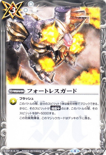 ![]() ![]() | BS41-090 フォートレスガード マジック 煌臨編 第2章:蒼キ海賊 C 色:白 ブロック:4 コスト:3 軽減:[白2] フラッシュ このバトルの間、自分のスピリット1体は疲労状態でブロックできる。さらに、そのスピリットが【煌臨中】のとき、このバトルの間、そのスピリットをBP+5000する。 この効果発揮後、このマジックカードはデッキの下に戻る。 illust:高坂 巧 |