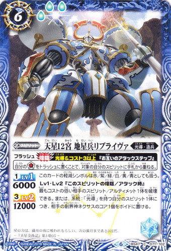 ![]() ![]() | BS47-071 天星12宮 地星兵リブライヴァ スピリット 神煌臨編 第4章:神の帰還 C 色:青 系統:光導・造兵 ブロック:5 コスト:6 軽減:[神3] シンボル:[青1] [1]LV1:6000 [3]LV2:12000 フラッシュ【煌臨】光導&コスト3以上『お互いのアタックステップ』 自分のソウルコアをトラッシュに置くことで、対象の自分のスピリットに手札から重ねる。 このカードの軽減シンボルは赤/紫/緑/白/黄/青としても扱う。 Lv1・Lv2『このスピリットの煌臨/アタック時』 最もコストの低い相手のスピリット/アルティメット1体を破壊できる。または、系統:「光導」を持つ自分のスピリット1体につき、相手の創界神ネクサスのコア1個をボイドに置ける。 星の力は、満月の夜に吸われるらしい。次の満月まであと3日だ。 ―『天星交渉記』第1項05― illust:高坂 巧 |