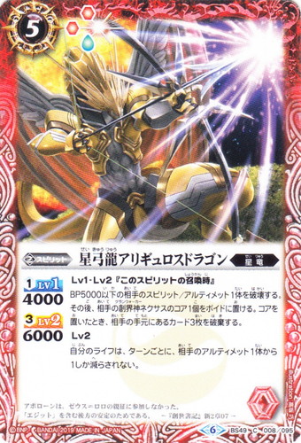 ![]() ![]() | BS49-008 星弓龍アリギュロスドラゴン スピリット 超煌臨編 第2章:双刃乃神 C 色:赤 系統:星竜 ブロック:6 コスト:5 軽減:[赤2][神1] シンボル:[赤1] [1]LV1:4000 [3]LV2:6000 Lv1・Lv2『このスピリットの召喚時』 BP5000以下の相手のスピリット/アルティメット1体を破壊する。その後、相手の創界神ネクサスのコア1個をボイドに置ける。コアを置いたとき、相手の手元にあるカード3枚を破棄する。 Lv2 自分のライフは、ターンごとに、相手のアルティメット1体から1しか減らされない。 アポローンは、ゼウス=ロロの親征に参加しなかった。 「エジット」を含む彼方の安定のためである。 ―『創世書記』新2章07― illust:高坂 巧 |