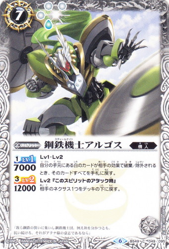 ![]() ![]() | BS49-049 鋼鉄機士アルゴス スピリット 超煌臨編 第2章:双刃乃神 C 色:白 系統:機人 ブロック:6 コスト:7 軽減:[白3][神1] シンボル:[白1] [1]LV1:7000 [3]LV2:12000 Lv1・Lv2 自分の手元にある白のカードが相手の効果で破棄/除外されるとき、そのカードすべてを手札に戻す。 Lv2『このスピリットのアタック時』 相手のネクサス1つをデッキの下に戻す。 「我ら鋼鉄の誓いに集いし鋼鉄機士団。例え袂を分かつとも、抗い続ける。それがアテナ様の意志であるなら」 illust:高坂 巧 |