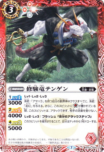 ![]() ![]() | BS52-004 修験竜テンゲン スピリット 転醒編 第1章:輪廻転生 C 色:赤 系統:天渡・武竜 ブロック:7 コスト:3 軽減:[赤2][白1] シンボル:[赤1] [1]LV1:3000 [2]LV2:4000 [4]LV3:5000 Lv1・Lv2・Lv3 系統:「アマハラ」を持つ自分の創界神ネクサスすべてに、系統:「起幻」を与える。さらに、このスピリットにソウルコアが置かれている間、このスピリットは、アタックできず、相手の効果を受けない。 Lv2・Lv3:フラッシュ『自分のアタックステップ』 このスピリットを疲労させることで、自分はデッキから1枚ドローする。 あの戦いが終わり、平和が戻ってきた平和であることは間違いないが、目下の命題は私の後継者の育成だ。 ―『創世書記』新5章01― illust:高坂 巧 |