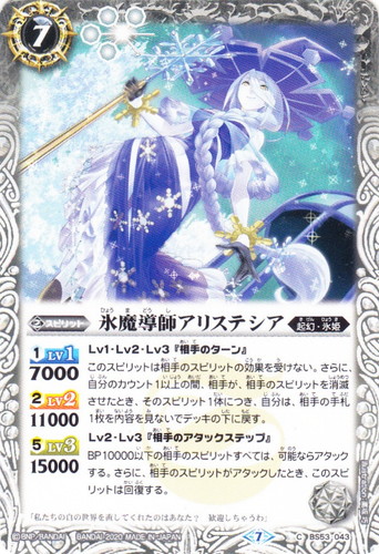 ![]() ![]() | BS53-043 氷魔導師アリステシア スピリット 転醒編 第2章:神出鬼没 C 色:白 系統:起幻・氷姫 ブロック:7 コスト:7 軽減:[白4] シンボル:[白1] [1]LV1:7000 [2]LV2:11000 [5]LV3:15000 Lv1・Lv2・Lv3『相手のターン』 このスピリットは相手のスピリットの効果を受けない。さらに、自分のカウント1以上の間、相手が、相手のスピリットを消滅させたとき、そのスピリット1体につき、自分は、相手の手札1枚を内容を見ないでデッキの下に戻す。 Lv2・Lv3『相手のアタックステップ』 BP10000以下の相手のスピリットすべては、可能ならアタックする。さらに、相手のスピリットがアタックしたとき、このスピリットは回復する。 「私たちの白の世界を直してくれたのはあなた?歓迎しちゃうわ」 illust:高坂 巧 |