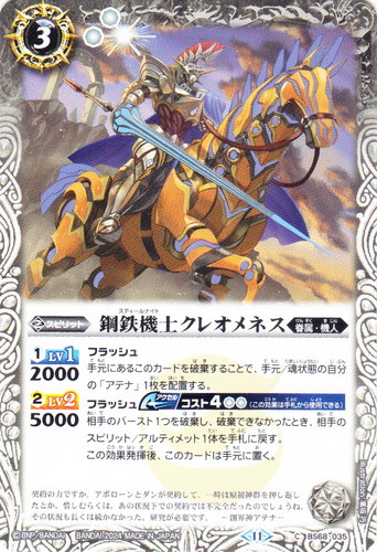 ![]() ![]() | BS68-035 鋼鉄機士クレオメネス スピリット 契約編:真 第1章:神々の戦い C 色:白 系統:眷属・機人 ブロック:11 コスト:3 軽減:[白2] シンボル:[白1] [1]LV1:2000 [2]LV2:5000 フラッシュ 手元にあるこのカードを破棄することで、手元/魂状態の自分の「アテナ」1枚を配置する。 フラッシュ【アクセル】コスト4[白2](この効果は手札から使用できる) 相手のバースト1つを破棄し、破棄できなかったとき、相手のスピリット/アルティメット1体を手札に戻す。 この効果発揮後、このカードは手元に置く。 契約の力ですか。アポローンとダンが契約して、一時は原初神群を押し返したとか。惜しむらくは、あの状況下での契約では不完全だったのでしょうね、その状況も長くは続かなかった。研究が必要です。 ―創界神アテナ― illust:高坂 巧 |
