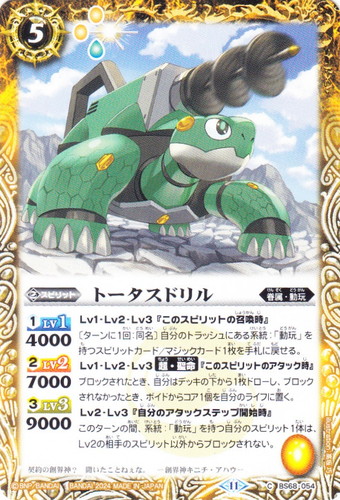 ![]() ![]() | BS68-054 トータスドリル スピリット 契約編:真 第1章:神々の戦い C 色:黄 系統:眷属・動玩 ブロック:11 コスト:5 軽減:[黄2][神1] シンボル:[黄1] [1]LV1:4000 [2]LV2:7000 [3]LV3:9000 Lv1・Lv2・Lv3『このスピリットの召喚時』 〔ターンに1回:同名〕自分のトラッシュにある系統:「動玩」を持つスピリットカード/マジックカード1枚を手札に戻せる。 Lv1・Lv2・Lv3【超・聖命】『このスピリットのアタック時』 ブロックされたとき、自分はデッキの下から1枚ドローし、ブロックされなかったとき、ボイドからコア1個を自分のライフに置く。 Lv2・Lv3『自分のアタックステップ開始時』 このターンの間、系統:「動玩」を持つ自分のスピリット1体は、Lv2の相手のスピリット以外からブロックされない。 契約の創界神?聞いたことねぇな。 ―創界神キニチ・アハウ― illust:高坂 巧 |