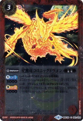 ![]() ![]() | BSC34-001 星渡竜コロニックドラゴン スピリット オールキラブースター【神光の導き】 C(foil) 色:赤 系統:星竜 ブロック:6 コスト:3 軽減:[赤1] シンボル:[赤1] [1]LV1:3000 [3]LV2:5000 Lv1・Lv2『このスピリットの召喚時』 自分のトラッシュにある神話ブレイヴカード1枚を手札に戻す。 Lv2:フラッシュ『お互いのアタックステップ』 自分の神話ブレイヴがあるとき、2コスト支払うことで、BP6000以下の相手のスピリット/アルティメット1体を破壊する。 『創界神アレックス謀叛の上、逃亡』その一報は「グランロロ」の全スピリットを震感させた。 ―『創世書記』グラン・ロロ伝01― illust:高坂 巧 |