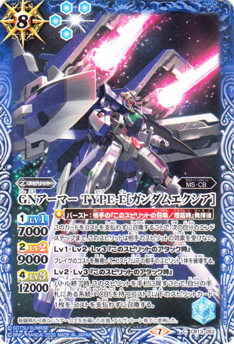 ![]() ![]() | CB13-053 GNアーマー TYPE-E[ガンダムエクシア] スピリット コラボブースター【ガンダム ~宇宙を駆ける戦士~】 C(foil) 色:青 系統:MS・CB ブロック:7 コスト:8 軽減:[青4] シンボル:[青1] [1]LV1:7000 [2]LV2:9000 [4]LV3:12000 【バースト:相手の『このスピリットの召喚/煌臨時』発揮後】 このカードをコストを支払わずに召喚することで、次の自分のエンドステップまで、このスピリットは相手のスピリットの効果を受けない。 Lv1・Lv2・Lv3『このスピリットのアタック時』 ブレイヴのコストを無視して、コスト7以下の相手のスピリット1体を破壊する。 Lv2・Lv3『このスピリットのアタック時』 バトル終了時、このスピリットを手札に戻すことで、自分の手札にある系統:「CB」を持つコスト7以下のスピリットカード1枚を、コストを支払わずに召喚する。 格闘戦も可能なGNアームズを装備した状態。アルヴァトーレ相手に奮戦した。 illust:高坂 巧 作品名:機動戦士ガンダム00/機動戦士ガンダムシリーズ |