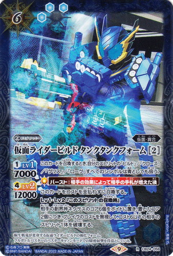 ![]() ![]() | CB24-058 仮面ライダービルド タンクタンクフォーム[2] スピリット コラボブースター【仮面ライダー ~最高の相棒~】 R 色:青 系統:仮面・異合 ブロック:9 コスト:6 軽減:[青3] シンボル:[青1] [1]LV1:7000 [4]LV2:12000 このカードを召喚するとき、自分のスピリットの「ビルド」/「クローズ」/「グリス」/「ローグ」すべてのシンボルは青としても扱う。 【バースト:相手の効果によって相手の手札が増えた後】 このカードをコストを支払わずに召喚する。 Lv1・Lv2『このスピリットの召喚時』 相手の創界神ネクサスのコア6個をボイドに置き、置いたコア2個につき、ブレイヴのコストを無視して、コスト6以下の相手のスピリット1体を破壊する。 桐生戦兎が返信する仮面ライダービルドの強化フォーム。 フルボトルバスターのバスターキャノンモードでの精密射撃を得意としている。 illust:高坂 巧 作品名:仮面ライダーシリーズ |