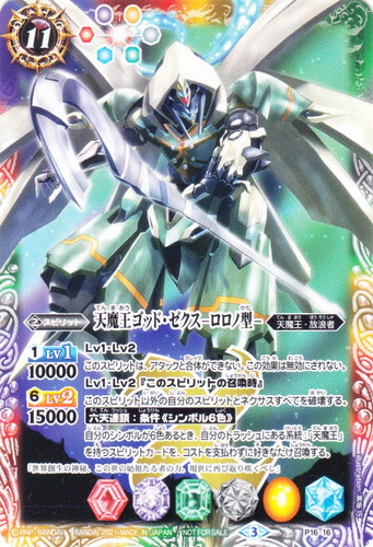 ![]() ![]() | P16-16 天魔王ゴッド・ゼクス―ロロノ型― スピリット プロモーションカード(P16) 色:赤/紫/黄/白/緑/青 系統:天魔王・放浪者 ブロック:3 コスト:11 軽減:[赤1][紫1][黄1][白1][緑1][青1] シンボル:[赤1][紫1][緑1][白1][黄1][青1] [1]LV1:10000 [6]LV2:15000 Lv1・Lv2 このスピリットは、アタックと合体ができない。この効果は無効にされない。 Lv1・Lv2『このスピリットの召喚時』 このスピリット以外の自分のスピリットとネクサスすべてを破壊する。 【六天連鎖:条件《シンボル6色》 自分のシンボルが6色あるとき、自分のトラッシュにある系統:「天魔王」を持つスピリットカードを、コストを支払わずに好きなだけ召喚する。 「世界創生の神秘、この世の始祖たる者の力。現世に再び返り咲くべし」 illust:高坂 巧 |