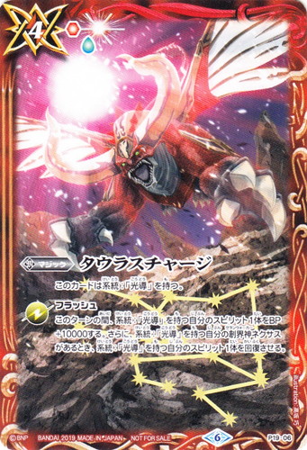 ![]() ![]() | P19-06 タウラスチャージ マジック プロモーションカード(P19) 色:赤 ブロック:6 コスト:4 軽減:[赤1][神1] このカードは系統:「光導」を持つ。 フラッシュ このターンの間、系統:「光導」を持つ自分のスピリット1体をBP+10000する。さらに、系統:「光導」を持つ自分の創界神ネクサスがあるとき、系統:「光導」を持つ自分のスピリット1体を回復させる。 illust:高坂 巧 |
