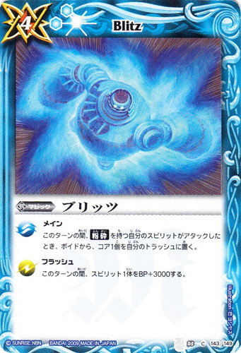 ![]() ![]() | BS03-143 ブリッツガンダム マジック 第3弾:覇闘 C 色:青 コスト:4 軽減:[青2] メイン このターンの間、【粉砕】を持つ自分のスピリットがアタックしたとき、ボイドから、コア1個を自分のトラッシュに置く。 フラッシュ このターンの間、スピリット1体をBP+3000する。 illust:巴ヨシヤス |