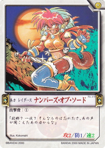 ![]() ![]() | No.α9 ナンバーズ・オブ・ソード 兵力 カオスギアα 基本セット 勢力:カオスフォーマー タイプ:レイダース コスト:0 攻:2 防:1 速:2 出撃費:① 「故郷?一族?そんなものは忘れたさ。あの声が聞こえたあの日からな」 illust:Kokomahi |