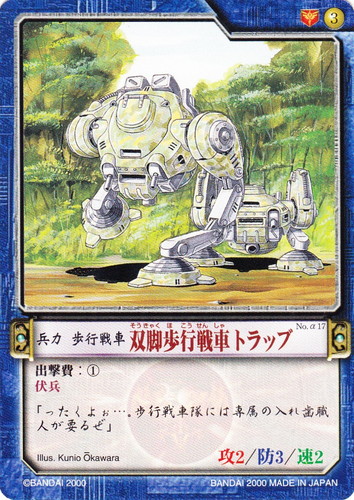 ![]() ![]() | No.α17 双脚歩行戦車トラップ 兵力 カオスギアα 基本セット 勢力:デ・バース帝国 タイプ:歩行戦車 コスト:3 必要影響力:デ・バース帝国1 攻:2 防:3 速:2 出撃費:① 伏兵 「ったくよぉ・・・。歩行戦車隊には専属の入れ歯職人が要るぜ」 illust:Kunio Okawara |