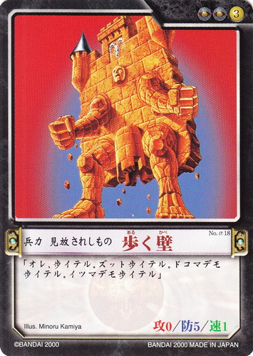 ![]() ![]() | No.α18 歩く壁 兵力 カオスギアα 基本セット 勢力:エレアル旅団 タイプ:見放されしもの コスト:3 必要影響力:エレアル旅団2 攻:0 防:5 速:1 「オレ、歩イテル。ズット歩イテル。ドコマデモ歩イテル。イツマデモ歩イテル」 illust:Minoru Kamiya |
