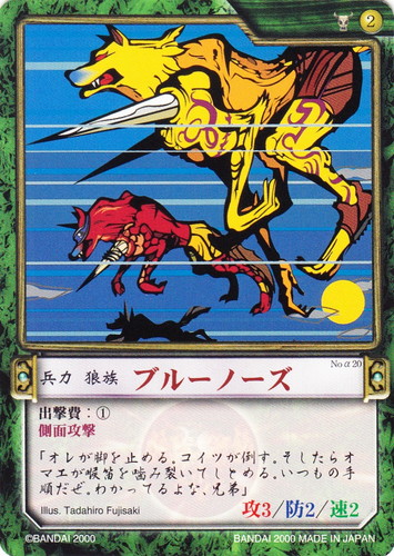 ![]() ![]() | No.α20 ブルーノーズ 兵力 カオスギアα 基本セット 勢力:ガイア族 タイプ:狼族 コスト:2 必要影響力:ガイア族1 攻:3 防:2 速:2 出撃費:① 側面攻撃 「オレが脚を止める。コイツが倒す。そしたらオマエが喉笛を噛み裂いてしとめる。いつもの手順だぜ。わかってるよな、兄弟」 illust:Tadahiro Fujisaki |
