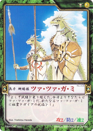 ![]() ![]() | No.37 ツァ・ツァ・ガ・ミ 兵力 基本セット 勢力:ガイア族 タイプ:蜥蜴族 コスト:2 必要影響力:ガイア族1 攻:2 防:2 速:2 「ツァ・ツァ・ガ・ミってのは、蜥蜴族の言葉で一人前の戦士という意味だ。それ以外の呼び方は侮辱になる。殺されても文句はいえぬぞ」 illust:Yoshirou Harada |