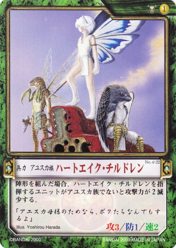 ![]() ![]() | No.α22 ハートエイク・チルドレン 兵力 カオスギアα 基本セット 勢力:ガイア族 タイプ:アユスカ族 コスト:1 必要影響力:ガイア族1 攻:3 防:1 速:2 陣形を組んだ場合、ハートエイク・チルドレンを指揮するユニットがアユスカ族でないと攻撃力が2減少する。 「アユスカ母様のためなら、ボクたちなんでもするよ」 illust:Yoshirou Harada |