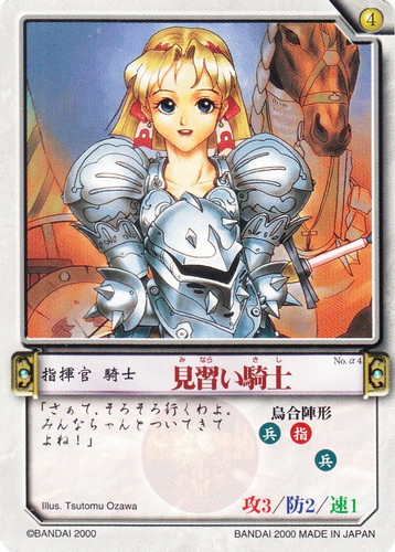 ![]() ![]() | No.α4 見習い騎士 指揮官 カオスギアα 基本セット 勢力:カオスフォーマー タイプ:騎士 コスト:4 攻:3 防:2 速:1 陣形:烏合陣形 兵指□ □□兵 「さぁて、そろそろ行くわよ。みんなちゃんとついてきてよね!」 illust:Tsutomu Ozawa |