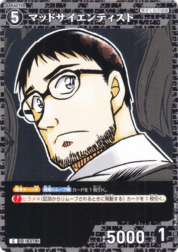 ![]() ![]() | B03130 マッドサイエンティスト キャラクター 拡張パック 第3弾 黒影の襲来 C 色:黒 レベル:5 AP:5000 LP:1 特徴:黒ずくめの組織 【相手ターン中】【現場リムーブ時】カードを1枚引く。 【ヒラメキ】(証拠からリムーブされるときに発動する)カードを1枚引く。 |