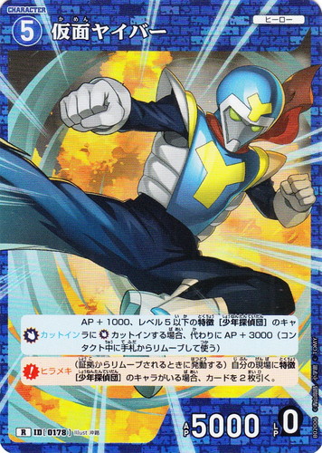 ![]() ![]() | B02006 仮面ヤイバー キャラクター 拡張パック 第2弾 西と東の大決戦 R 色:青 レベル:5 AP:5000 LP:0 特徴:ヒーロー 【カットイン】AP+1000、レベル5以下の特徴[少年探偵団]のキャラにカットインする場合、代わりにAP+3000(コンタクト中に手札からリムーブして使う) 【ヒラメキ】(証拠からリムーブされるときに発動する)自分の現場に特徴[少年探偵団]のキャラがいる場合、カードを2枚引く。 illust:沖路 |