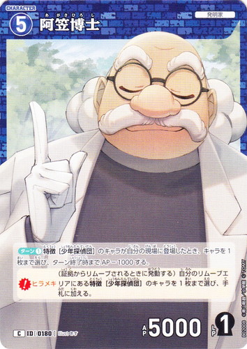 ![]() ![]() | B02008 阿笠博士 キャラクター 拡張パック 第2弾 西と東の大決戦 C 色:青 レベル:5 AP:5000 LP:1 特徴:発明家 【ターン①】特徴[少年探偵団]のキャラが自分の現場に登場したとき、キャラを1枚まで選び、ターン終了時までAP-1000する。 【ヒラメキ】(証拠からリムーブされるときに発動する)自分のリムーブエリアにある特徴[少年探偵団]のキャラを1枚まで選び、手札に加える。 illust:あす |