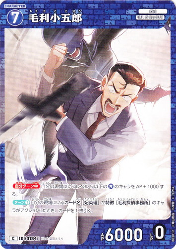 ![]() ![]() | B02012 毛利小五郎 キャラクター 拡張パック 第2弾 西と東の大決戦 C 色:青 レベル:7 AP:6000 LP:0 特徴:探偵/毛利探偵事務所 【自分ターン中】自分の現場にいるレベル5以下の青のキャラをAP+1000する。 【ターン①】自分の現場にいるカード名[妃英理]か特徴[毛利探偵事務所]のキャラがアクションしたとき、カードを1枚引く。 illust:望田とうり |