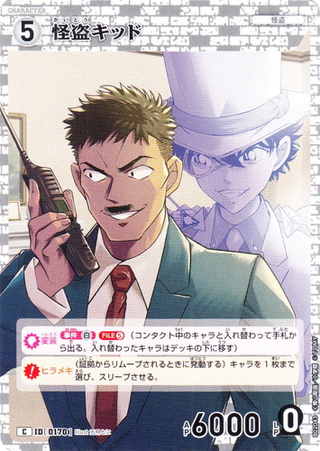 ![]() ![]() | B02053 「か、怪盗キッド!!!」 イベント 拡張パック 第2弾 西と東の大決戦 C 色:白 レベル:7 自分のリムーブエリアにあるレベル7以下の白の特徴[怪盗]のキャラを1枚まで選び、登場させる。 【ヒラメキ】(証拠からリムーブされるときに発動する)自分のリムーブエリアにある白の特徴[怪盗]のキャラを1枚まで選び、手札に加える。 |