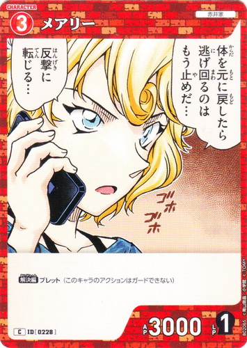 ![]() ![]() | B02065 メアリー キャラクター 拡張パック 第2弾 西と東の大決戦 C 色:赤 レベル:3 AP:3000 LP:1 特徴:赤井家 【解決編】ブレット(このキャラのアクションはガードできない) |