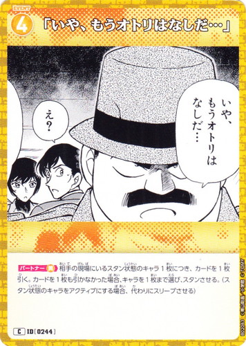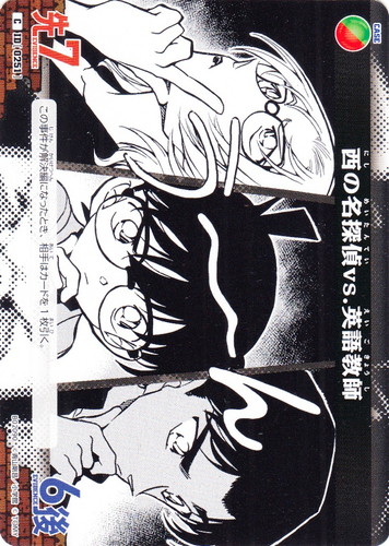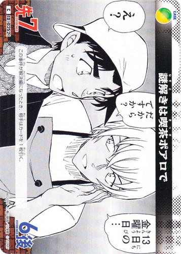 ![]() ![]() | B02091 謎解きは喫茶ポアロで 事件 拡張パック 第2弾 西と東の大決戦 C 色:緑/黄 事件レベル:先7/後6 この事件が解決編になったとき、相手はカードを1枚引く。 |