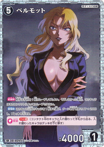 ![]() ![]() | B02086 ベルモット キャラクター 拡張パック 第2弾 西と東の大決戦 SR 色:黒 レベル:5 AP:4000 LP:1 特徴:黒ずくめの組織 【変装時】相手は手札を1枚リムーブしてもよい。そうしなかった場合、このキャラはこのコンタクトによってリムーブされない。 【登場時】このキャラ以外のキャラを1枚まで選び、ターン終了時までAP+2000し、ブレットを与える。 【変装】【FILE⑤】(コンタクト中のキャラと入れ替わって手札から出る。入れ替わったキャラはデッキの下に移す) illust:伊禮ゆきとし |