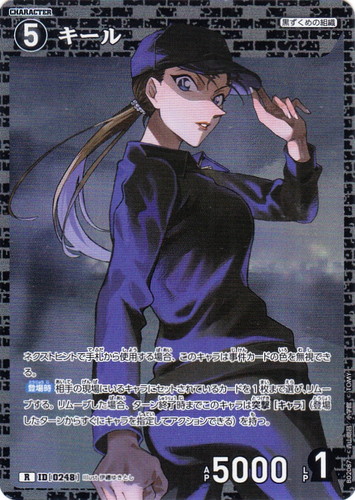 ![]() ![]() | B02087 キール キャラクター 拡張パック 第2弾 西と東の大決戦 R 色:黒 レベル:5 AP:5000 LP:1 特徴:黒ずくめの組織 ネクストヒントで手札から使用する場合、このキャラは事件カードの色を無視できる。 【登場時】相手の現場にいるキャラにセットされているカードを1枚まで選び、リムーブする。リムーブした場合、ターン終了時までこのキャラは突撃[キャラ](登場したターンからすぐにキャラを指定してアクションできる)を持つ。 illust:伊禮ゆきとし |