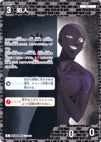 ![]() ![]() | B02088 犯人 キャラクター 拡張パック 第2弾 西と東の大決戦 C 色:黒 レベル:3 AP:0 LP:0 特徴:犯人 このキャラ以外のカード名[犯人]が自分の現場に登場したとき、このキャラをリムーブする。 自分か相手のターン終了時、自分の証拠を上から1つリムーブする。(【ヒラメキ】は発動しない)このキャラを表向きのまま証拠として得る。 【カットイン】自分の現場に空きがある場合、スリープ状態で登場させる。 【ヒラメキ】相手はこのアクションによって証拠を得られない。 illust:春木 |