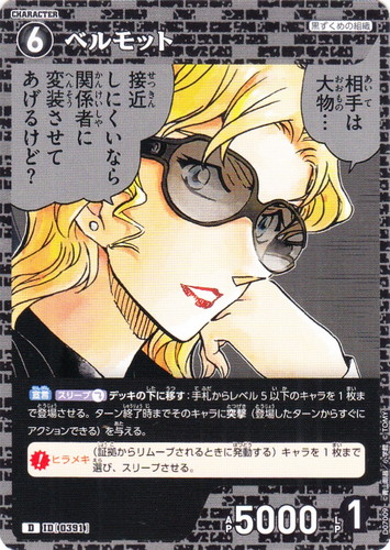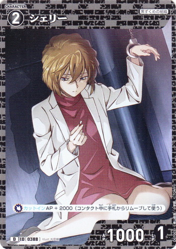 ![]() ![]() | D07003 シェリー キャラクター Case-ThemeDeck 02 黒ずくめの組織 D 色:黒 レベル:2 AP:1000 LP:1 特徴:黒ずくめの組織 【カットイン】AP+2000(コンタクト中に手札からリムーブして使う) illust:松田硯 |