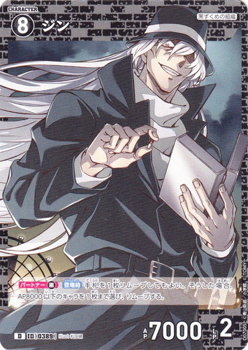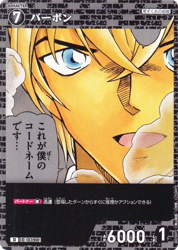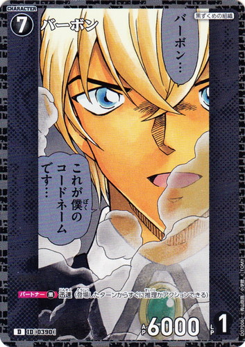 ![]() ![]() | D07007 バーボン キャラクター Case-ThemeDeck 02 黒ずくめの組織 D 色:黒 レベル:7 AP:6000 LP:1 特徴:黒ずくめの組織 【パートナー黒】迅速(登場したターンからすぐに推理かアクションできる) |